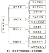 家庭资源,是指一个家庭赖以生存和发展所需要的物质和非物质资源,包括收入、财富、知识、技能、人力资源、信息、社会资本、声望、地位和权力等。首先,为便于分析和论述问题,本文特意将与农户家庭生存与发展所需的最基本的资源归纳为经济、教育、健康和发展四类资源,每类家庭资源下又细分为若干个子目,其分析框架结构形式见图1。其次,本文所提到的“边缘化”一词是近年来国内学术界颇为流行但却仍有争议的一个学术用语。归纳起来主要有以下几种观点:第一种观点是由美国社会学家帕克(Park)于上世纪20年代提出,是指因通婚、移民而使一些处于两种文化边缘的人产生一种心理上的失落感,导致他们既不为原来的种族或文化群体所接受,又不被现在的种族或文化群体所接纳,由此形成的文化上的差异。第二种观点形成于“二战”以后,由一些拉美学者所提出,特指由于城乡流动而引起的经济、社会和文化方面的冲突。第三种观点产生于20世纪70年代的欧洲,伴随80年代欧洲贫困问题的出现而流行。它指的是因为社会排斥而生活在社会边缘的被隔离的群体,特别是指那些没有被社会保障所覆盖的群体。第四种观点见于上世纪90年代以后,由国内女性学者李小江等人提出,认为“边缘”是一个相对于“主流”文化的概念:即“从政治上看,弱势的、无权的;从经济上看,落后的、不发达的;从文化上看,少数的、可以被忽略的”。本文基本上赞同后第四种观点对“边缘”一词的解释,所不同的是本文所说的“边缘化”,更强调它是一个动态发展的过程。在阐述的对象上,本文着眼于作为特定研究对象的西部地区草根妇女由于历史文化的积淀,以及现实生活中她们自身人力资本的匮乏,使得她们在家庭和社会资源分配中明显处于一个被“边缘化”的弱势状态。