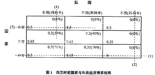 简单化考虑,国家收益有两方面,一是官营商业的利润,一是国家向私商征收的税赋等收入。由于社会经济必须有一定规模的商业,假定其规模不变,全部由私商经营时所得利润为1,由于国家经营商业成本高而效益低,假定其效益减半为0.5。对私商征收的税赋因政策变化而有不同,假定在“不管”政策下占其利润的30%,在“半管”或“全管”情况下加倍为60%。据此,在“不管”情况下,国家商业收益仅为商业税赋;若私商“全投”,为1×30%=0.3;私商“半投”,为0.5×30%=0.15;私商“不投”,为0。“全管”情况下,不论私商有无投入,其仅有官营商业收入,即1×50%=0.5。“半管”情况下,官商收入确定,私商税赋则据其投入而定,两方面合计,“全投”、“半投”,均为0.5×50%+0.5×60%=0.65;私商“不投”,则为0.5×50%+0×60%=0.25。