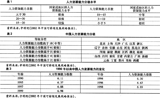 由表3得知,在20世纪90年代的10年里,中国人力资源能力建设大幅度提高,但与发达国家相比仍然差距明显。在25—64岁的年龄组中,受到高中以上教育的比例:美国87%,韩国66%,中国仅为18%;受过高等教育的比例:美国35%,韩国23%,中国仅为4.7%。随着经济全球化的发展,国际间竞争从根本上说就是人力资源能力的竞争。而我国的文盲人口为8507万,每10万人口中,小学程度的为35701人,初中程度的为33961人,即是说,我国初中以下文化程度的人口占到总人口的70%。2001年中国科协公布的科学素养调查情况表明,我国公众具备基本科学素质的比例只有1.4%,不到发达国家的1/10。科学文化素质偏低,已成为制约我国经济发展、社会进步和国际竞争力提高的关键因素之一。