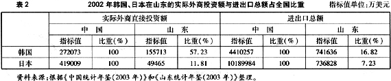 山东半岛因其独特的地理位置、经济基础、对外开放等方面的优势成为新一轮日韩制造业转移的首选地(见表2)。经济合作和经济圈是建立在互补性基础之上的,“环黄海经济圈”内各国地理位置的相邻性、生产要素的互补性、文化上的共通性,为开展“环黄海经济圈”国际合作提供了基础。为了减少成本及开拓海外市场,韩国、日本的大部分迁至海外的制造业企业都将中国看作首选目的地。韩国全国经济人联合会对在中韩两国均设有工厂的44个大企业进行调查的结果显示,韩国法人税平均比中国高3.2个百分点,工资水平高8倍,物流费用高1.9倍。随着中国政府为外国企业制造宽松的投资环境,更多的韩国制造企业选择中国,有的甚至将核心研发部门也迁至中国。日本经济产业省发表的2002年度日本制造业白皮书称,日本对华制造业投资战略将发生巨大变化:将中国单纯作为生产基地的企业大幅下降,而将中国同时作为生产基地和销售市场的企业将大幅上升。正处于工业化初级阶段的山东,与发达国家和新兴工业化国家,在产业发展水平和产业结构上存在着一定的“梯度错位”空间,发展国际合作和承接产业转移具有很强互补性,为山东与日韩等国扩大合作提供了难得机遇。