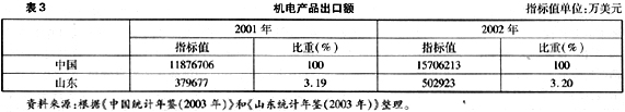 长。问题主要表现在两个方面:第一,山东省总体制造业结构层次偏低,科技含量相对较高的电子及通讯设备和仪器仪表制造业,仅占装备业的12.39%。目前,山东省有近50%的设备落后于国际国内先进水平,达到20世纪90年代先进水平的仅占10%,数控化率不到9%。第二,山东省制造业参与国际经济大循环程度低。一方面,吸引外资较少,外商资本占实收资本的比例为18.73%,低于全国水平;另一方面,出口产品值低于全国平均水平,居全国第10位,机电产品出口额也大大低于全国水平,2001年和2002年仅占全国的3.2%(见表3)。