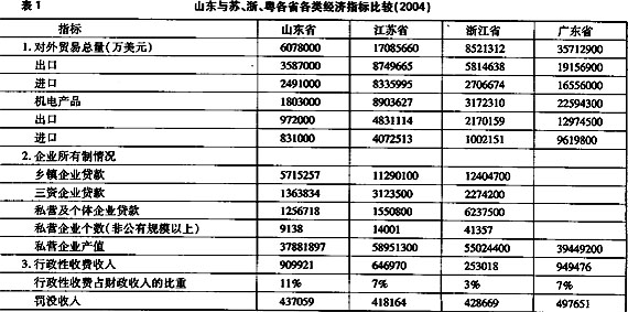 从上面的指标分析可以看出,山东省对外贸易水平以及经济总体发展水平与苏、浙、粤等省还存在着差距。这些差距可能基于一些客观原因,例如,广东毗邻香港,广东人和香港人之间存在着许多亲缘联系;江苏和浙江靠近上海,而上海是中国最大的金融、技术、信息等要素的辐射源。但山东与上述省份之间所存在的制度差异也是不能忽视的。这方面的差异,从上面的指标分析中也可见一斑。在私有企业发展水平上,山东就不如上述诸省,这也意味着山东在产权明确程度上不如这些省份。很多私有企业的发展都面临着资金不足的困难,但山东对私有企业贷款却明显低于江苏和浙江。这就意味着在政府应当退出、交由市场调节的企业经营领域,山东省退得还不如苏、浙、粤程度高。