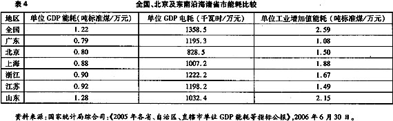 能源消耗比较。据国家统计局最新统计,在单位GDP能耗和单位工业增加值能耗上山东均列全国第6位。见表4。