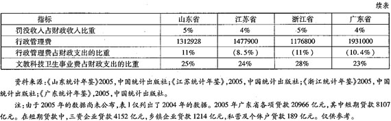 要考核政府的效率,单靠山东行政性收费收入占财政收入的比重和行政性管理费占财政支出的比重这两个指标是远远不够的,但即使在这两个指标上,山东的表现也逊色于苏、浙、粤。山东行政性收费收入所表示的是非制度化的收入,由于它不是制度化的,故其随意性比较大。它在财政收入中所占的比重高,表示非制度化的、随意性财政收入比较多。制度的作用在很大程度上是为了约束政府的随意性。如果随意性财政收入过高,则表明政府行为随意性程度也比较高。但山东的这一指标均高于苏、浙、粤。行政管理费占财政支出的比重所体现的是政府的规模,在一个市场经济发达的地方,政府规模应该是比较小的。在目前政府机构过于臃肿的情况下,行政管理费占财政支出的比重当然是越小越好。山东政府所提供的公共物品并不比苏、浙、粤各省多,而政府的行政开支却多于苏、浙、粤,这说明,山东省各级政府的工作效率还有亟待提高之处。