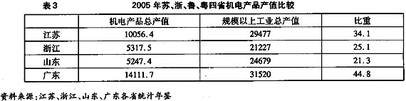 高新技术产业发展比较。由于统计口径问题,我们找不到关于苏、浙、鲁、粤四省高新技术产业发展状况的可比性数据,只能用机电产品来作一替代。从表3可以看到,在机电产品发展上,山东落后于其他三省。