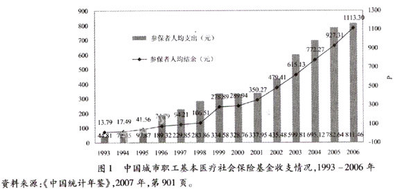 2006年,城镇职工医保个人的缴费水平为377.17元,加上雇主的缴费,人均缴费总水平达到1508.68元(参见表1)。由于城镇职工医保基金人均结余额较高(参见图1),因此这项公立医疗保险的保障力度可以提