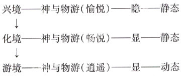 其次,从“游而至乐”的“游”来看,“兴”、“化”、“游”这三重境界中也是层进式的,在“兴境”和“化境”中都有“神与物游”也即都有“物”与“我”之间精神上的融通,但这种“融通”是笼罩着浓郁的“静”的氛围的,是悄无声息的“游”,是隐性的“游”,“游”(即神思和想象)也只是显示了“化”的过程(虚静——超然——愉悦)和结果(无我),也即是写“化”的静态,而没有将“化”的动态显现出来,没有将“物化”后产生的新的主体(纯粹的我)的动态感显现出来。而在“物化”的第三个层次,也即“游境”中,这种大“动”显现出来了。这一“动”是“神思飞跃”的“动”,是“显性”的“动”,是“精鹜八极,心游万仞”的动,是精神随物而逍遥畅游。“兴”、“化”、“游”这三个层次境界越来越高、“动感”也越来越“显”、“动”的态势也越来越强。从这一方面来看,“游境”也是“物化”中的最高层次: