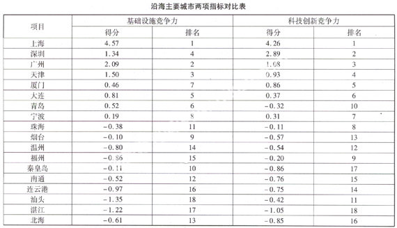 中国经济改革研究基金会按照国际标准对沿海主要城市综合竞争力所做的排名结果显示,城市科技创新竞争力决定着基础设施竞争力。如下表