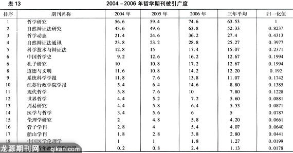 除了期刊被引次数、影响因子、被引速率以外,衡量期刊学术影响的还有一个重要指标,即期刊被引广度。它反映的是某种期刊相对其他期刊的影响力(更确切地说是对其他期刊的文章作者的影响力)。一般说来,引用一种期刊的期刊种数越多,该期刊的被引广度就越大。但是,如果在一个年度内,某期刊被他刊引用1-2次,这种引用带有很大的偶然性。所以,为了使期刊被引广度的计算更加科学合理,苏新宁教授将期刊被引次数为5次以内(不含5次)的分值进行了重新分配。表13给出了2004-2006年哲学期刊被引广度和三年的平均值,再以该指标最大的平均广度值(《哲学研究》的63.53)作分母得到各期刊的归一化值。本表按三年平均被引广度从大到小排序。