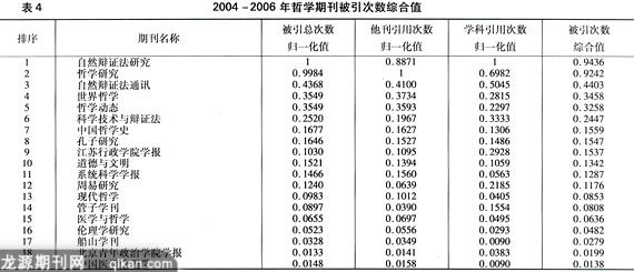 期刊被引次数是反映期刊长期学术影响的重要指标,它包括被引总次数、他刊引用次数和学科引用次数三项指标。这三个指标分别体现了某种期刊在整个人文社会科学中的总影响、在学科内的影响和对其他期刊的影响,选择这三种被引次数主要考虑了它们之间可以相互补充。根据三种被引次数所占角色和作用,另外也考虑到有两种被引次数的计算含有自引的数据,非来源期刊在此方面处于劣势。因此,本文对他引次数赋予较高的比重,即50%,其他两个被引次数各占25%的比重。表4给出了2004-2006年哲学期刊被引次数各指标的归一化值和综合值。综合值计算方法为:按照权重分配,将每一种期刊的被引总次数和学科引用次数的归一化值分别乘以0.25,他刊引用次数乘以0.5,然后将这三个结果相加得到各期刊的被引次数综合值。本表按被引次数综合值从大到小排序。