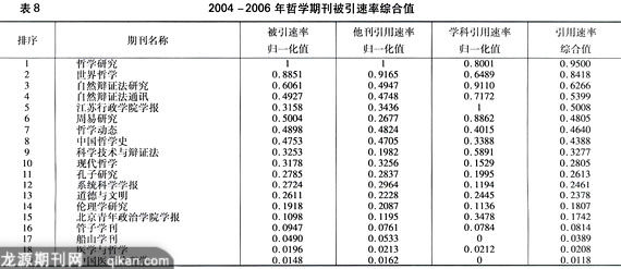 三项指标。与期刊被引次数类似,各指标的权重分配分别为25%,50%,25%。表8给出了2004-2006年哲学期刊被引速率综合值计算。其方法与期刊被引次数综合值的计算完全相同,可以参见表4前的解释。本表按被引速率综合值从大到小排序。
