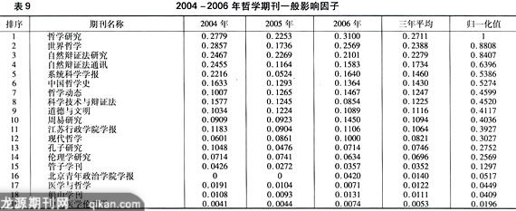 修订后的影响因子的计算方法是该刊前第2、3年发表论文在统计当年被引用的总次数与该刊前第2、3年发表论文总数的比值。它反映了期刊的相对影响和重要程度。表9给出了2004-2006年哲学期刊一般影响因子和三年的平均值,最后用0.2711(即该指标最大的平均值)作分母去除每一种期刊这一指标的平均值,从而得到各期刊的一般影响因子的归一化值。本表按三年平均影响因子从大到小排序。