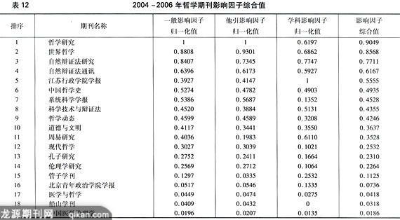 与期刊被引次数和被引速率相同,期刊影响因子的三个下级指标权重分配为:一般影响因子(25%)、他引影响因子(50%)、学科影响因子(25%)。表12给出了2004-2006年哲学期刊影响因子综合值计算,其方法与期刊被引次数和被引速率相同。计算后得到各期刊影响因子的综合值。本表按影响因子综合值从大到小排序。