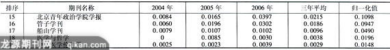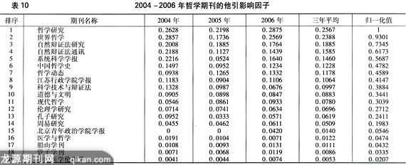 从他引影响因子和一般影响因子对比可以发现,《周易研究》、《科学技术与辩证法》等期刊由于期刊学科覆盖面较窄,反映出自引率较高。所以,这两种期刊在他引影响因子的名次上较一般影响因子的排序有所下降。