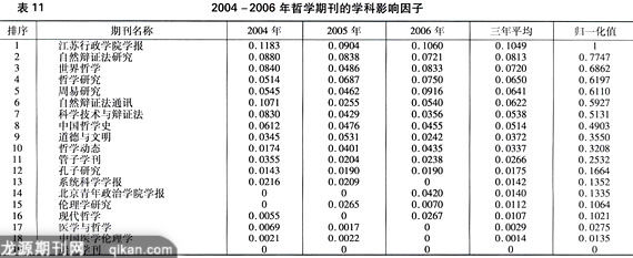通过学科影响因子的研究,可以分析期刊对本学科研究的影响,能够反映期刊所刊载的论文与本学科研究的相关程度。表11给出了2004-2006年哲学期刊学科影响因子统计。同样的,也包括各年度的学科影响因子、三年平均影响因子,并以学科影响因子最大的平均值(《江苏行政学院学报》的0.1049)作分母得到各期刊该指标的归一化值。本表按三年平均影响因子从大到小排序。