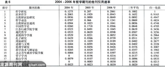 修订后的他刊即年指数即为他刊引用速率,它表示该刊当年论文和前一年论文在当年被其他期刊引用的次数与该刊当年发表的和前一年发表的论文总数的比值。这样,将自引排除在外,为来源期刊与非来源期刊统计的公平性创造了一个良好的条件。表6给出了2004-2006年哲学期刊他刊引用速率统计。三年平均值由表中各年度数据进行平均计算得出,再用最大的平均值(《哲学研究》的0.1802)作分母求得每一种期刊该指标的归一化值。本表按三年平均速率从大到小排序。