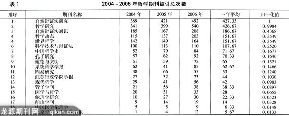 2004-2006年,CSSCI收录哲学类来源期刊11种(2004-2005年)和12种(2006年)。此期间,哲学类来源期刊共收录来源文献数4937篇,这些来源文献引用中文人文社会科学学术期刊647种。为了研究的全面性和科学性,本文将研究对象扩展到19种期刊,以哲学类17种学术期刊为主。另外,还包括一些非纯哲学期刊(《江苏行政学院学报》和《北京青年政治学院学报》),它们在哲学研究中发挥着很大的作用,这些期刊不但发表了不少哲学方面的文章,而且他们的被引主要来自于哲学论文。