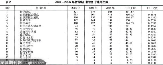期刊他引次数的统计是为了平衡来源期刊与非来源期刊指标公平性,这一指标杜绝了来源期刊为了提高被引次数而盲目自引的可能。表2给出了2004-2006年哲学期刊他刊引用次数统计。其中包括各年度的他刊引用次数,然后进行平均计算得到平均值,最后用最大的平均值(《哲学研究》的401.67)作除数得到每一种期刊该指标的归一化值。本表按三年平均次数从大到小排序。