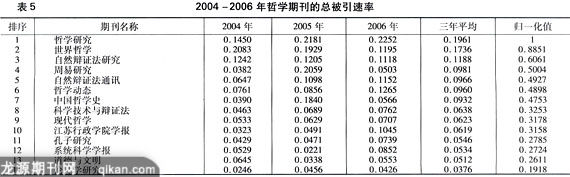 根据苏新宁教授对总被引速率的定义,期刊总被引速率是该刊当年论文和前一年论文在当年被引用总次数与该刊当年发表的和前一年发表的论文总数的比值。被引速率在即年指数的基础上进行扩展,更科学地反映了期刊对学科热点的关注程度和反应速度。表5给出了2004-2006年哲学期刊总被引速率和三年的平均值,然后取最大的平均值(《哲学研究》的0.1961)作除数得到各期刊的被引速率归一化值。本表按三年平均速率从大到小排序。