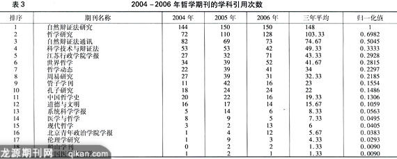 期刊的学科引用次数主要用于考察期刊在本学科的学术影响。表3给出了2004-2006年哲学期刊学科引用次数统计。与上表相同,也包括各期刊的年度学科引用次数、三年平均引用次数,并以最大的学科引用次数(《自然辩证法研究》的148)作分母,计算出每一种期刊的学科引用次数的归一化值。本表按三年平均次数从大到小排序。