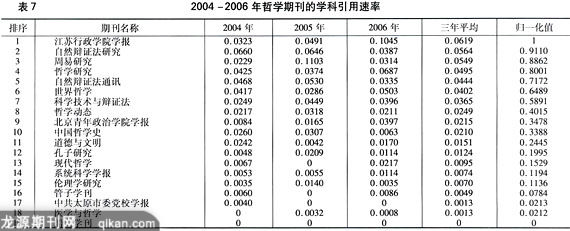 在本学科论文引用次数上,三年平均值排在前两位的依旧是《自然辩证法研究》和《哲学研究》,两期刊三年平均值均超过100次,3至7位为《自然辩证法通讯》、《科学技术与辩证法》、《江苏行政学院学报》、《世界哲学》和《哲学动态》,与前两个指标反映结果基本相同。从2004-2006年的变化情况来看,本学科引用次数增加值较多的为《哲学研究》和《江苏行政学院学报》,分别增加56次和44次,增加幅度上也是这两个期刊增加较大,说明这两个期刊在哲学学科内的影响力不断加大。