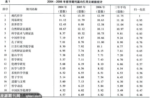 从哲学学科来看,2004-2006年CSSCI哲学来源期刊的篇均引文(为8.19篇)居人文社会科学(为8.20篇)的中游水平,低于历史学、中国文学、外国文学等人文学科。表1给出了2004-2006年哲学期刊篇均引用文献数统计以及三年平均引用文献篇数,并对各期刊进行了归一化处理。其中归一化值是以各期刊三年平均篇数作为分子,三年平均篇数的最大值为分母,计算而得。本数据中《现代哲学》的平均篇数最大(11.75篇),作为分母,其归一化值为1,其余期刊的归一化值均小于1。本表按各期刊三年平均引用文献篇数从大到小排序。