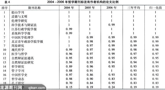作者机构标注比例也是衡量期刊规范程度的重要指标之一。可以认为,论文的作者机构是其重要组成部分,它不仅方便了读者与作者之间的交流,也为学界了解各机构的研究实力和学术交流提供了信息。自1998年来,CSSCI来源期刊作者机构的标注比例不断上升,来源期刊的机构标注比例由1998年的83.2%上升到2006年的95.6%,期刊的规范程度不断提高。CSSCI对人文社会科学学术期刊规范化起到了积极的作用。从哲学学科的角度来看,2004-2006年CSSCI哲学来源期刊的机构标注比为93.1%,低于人文社会科学的比例(94.4%)。表4给出了2004-2006年哲学期刊标注有作者机构的论文比例及三年平均值,并对平均值进行了归一化计算。本表按三年平均数从大到小排序。
