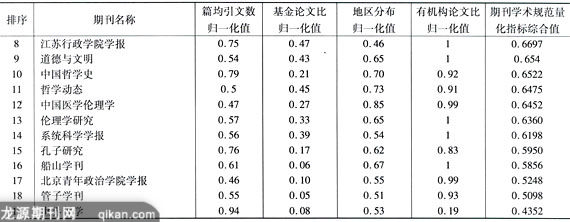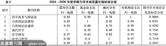 期刊学术规范量化指标在期刊评价中占有重要的位置,其主要反映期刊的规范程度和学术质量,包括期刊论文的篇均引用文献数、期刊基金论文占有比例、期刊作者地区分布以及期刊标注有作者机构的论文比例这四项指标。由于很难考察其中各指标的重要程度,所以本文按照四项指标平均分配总指标比率,各占25%,得到期刊学术规范量化指标综合值。表5给出了2004-2006年哲学期刊学术规范量化各指标的归一化值和综合值。综合值计算方法为:将每一种期刊的学术规范量化指标的归一化值乘以0.25,然后求和计算得到各期刊的综合值。本表按各期刊学术规范量化指标综合值从大到小排序。