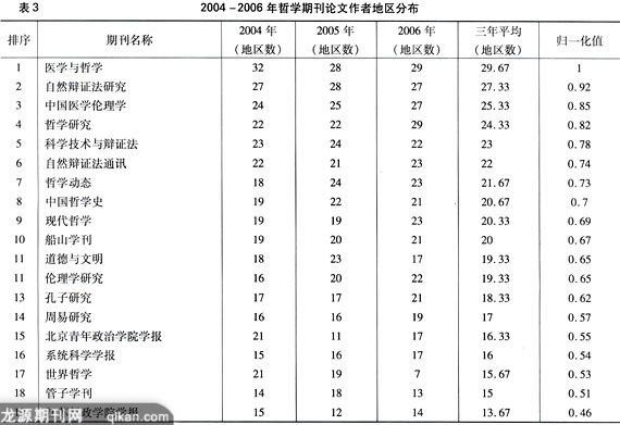 本研究中的作者地区包括我国现有的31个省市自治区和港、澳、台,以及国外的国家和地区(国外的地区分布数以国家为计量单位)。表3给出了2004-2006年哲学期刊论文作者地区分布数及三年平均值,并对平均值进行了归一化计算。本表的归一化分母数是三年平均的最大值,即《医学与哲学》的29.67。本表按三年平均地区数从大到小排序。