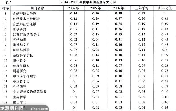 从表2可以看到,2004-2006年,哲学期刊的平均基金论文比为0.11。其中,CSSCI哲学类来源期刊的平均基金论文比为0.12,哲学类本文讨论的非来源期刊的平均基金论文比为0.08,两者相差0.04。说明非来源期刊整体的基金论文数量与哲学类来源期刊还是有一定的差距的。但是也有个别非来源期刊具有较高的基金论文比例,如《江苏行政学院学报》居于排名的第5位。来源期刊《世界哲学》和《管子学刊》,由于期刊本身的特殊性,前者以译文和专栏为主,后者研究对象的独特性,使这两种期刊刊载的基金论文相对较少。
