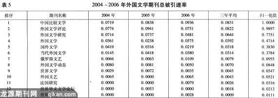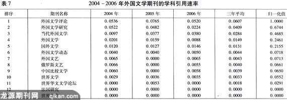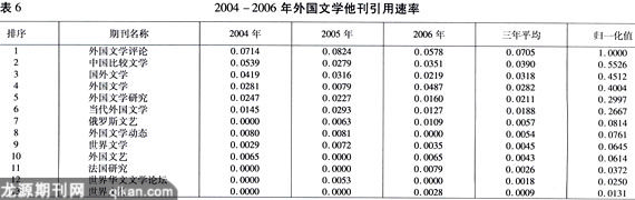 其他期刊引用速率是指该刊当年和前一年发表的论文在当年被其他期刊引用次数除以该刊当年发表的和前一年发表的论文总数得到的值。其他期刊引用速率与期刊总被引速率相比,去除了期刊自引的情况,能够更加客观、清晰地反映期刊对学者的影响力。表6给出了按照2004-2006年外国文学期刊他刊引用速率