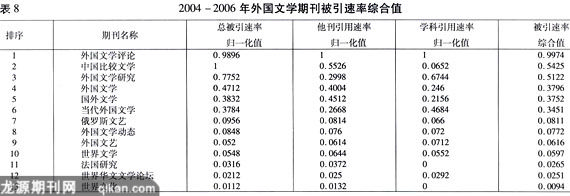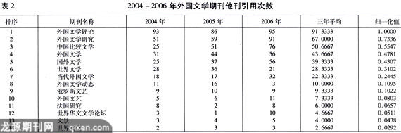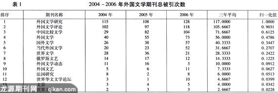 引文分析理论体系是由美国著名情报学家尤金·加菲尔德(Eugene Garfield)在20世纪50年代创立的,这一体系在创立之初主要针对自然科学期刊。在这一评价方法创立之后,经历了较大发展,不仅应用于自然科学,也应用于社会科学。中国社会科学引文索引(CSSCI)就是沿袭引文评价这一方法,并在此基础上结合我国社会科学研究的研究特点,从引文这一角度对我国社会科学研究进行揭示。本文主要根据苏新宁教授构建的人文社会科学期刊评价体系,并以此体系中的被引用指标对外国文学期刊进行评估,本文的引用数据主要来源于CSSCI。根据国家新闻出版总署发布的我国期刊目录,我国目前公开发行的外国文学类期刊有16种左右。CSSCI(2004-2006)每年均收录外国文学来源期刊6种。由于《中国比较文学》是一种横跨中外文学的跨学科期刊,大量的外国文学的研究论文引用该刊。根据引用情况,我们将该刊列入外国文学类期刊讨论。