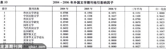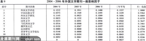 分析表9,外国文学期刊的一般影响因子与其他学科相比,稍显偏低。从本身内部来看,也层次分明。名列首位的是《外国文学评论》,其3年平均影响因子达到0.1537,紧随其后的是《中国比较文学》,其三年平均影响因子达到了0.1439,这两个期刊在影响因子方面可以代表外国文学期刊的第一方队。其他期刊的影响因子与这两种期刊有较大的差距。我们可以把它们再分成两个方队:前一个方队是影响因子位于0.05以上的4种期刊,《外国文学研究》、《外国文学》、《国外文学》和《当代外国文学》;剩余的期刊组成后一个方队。