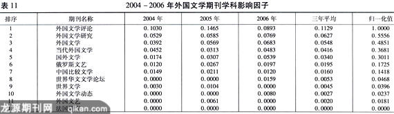 详细分析一些具体的期刊,如《法国研究》这样专门以一国语言、文学、历史、哲学、政法、经济等为研究对象的综合性学术刊物,力图反映出该国当代社会文化面貌和学科进展,为传播该国文化,加强国际问文化教育的交流和合作,起着一个桥梁和纽带的作用,虽然它们的影响因子略低于外国文学的纯粹学术研究刊物,但是其影响力也不容忽视。《外国文学动态》经常登载一些有关学术前沿的信息和资料,对学术研究具有十分重要的引导作用,但是其中的研究性长篇论文较少,所以它的影响因子居于第12位。