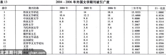 平均值排序的前13名,并进行了归一化处理,即以各期刊的他引速率的三年平均值作为分子,平均值的最大值(《外国文学评论》0.0705)为分母,计算而得。