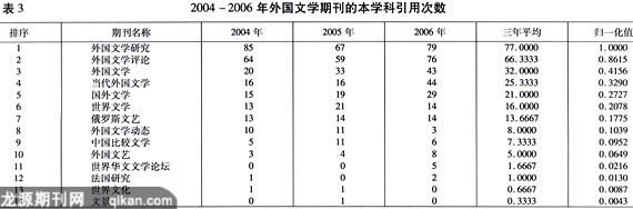 本学科论文引用次数是指特定学科(如外国文学)期刊被该学科论文所引用的次数。期刊的本学科引用次数反映了期刊在本学科的影响,同时也体现了期刊在本学科的使用率,以及在本学科领域内的学术影响力。表3给出了按照2004-2006年外国文学期刊被本学科论文引用次数的平均值排序的前14名,并进行了