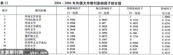 影响因子是采用较为科学的手段定量评估期刊的相对学术影响的一种方法。更通俗地说,就是根据期刊上发表的论文,并计算这些论文的篇均被引用率,来体现期刊的学术影响和社会效果,或者说是从学界对期刊所载论文的认可、利用程度来评估期刊的学术影响。根据人文社会科学期刊论文的被引用(年)峰值调整计算年代,移动计算年度,引入一般影响因子、他引影响因子和学科影响因子组成的影响因子综合值,从而达到了从不同的角度来反映期刊影响因子的目的。有关三种影响因子的权重分配为:一般影响因子和学科影响因子的权重赋予25%,他引影响因子赋予50%权重。表12按照归一化、加权后给出了2004—2006年外国文学期刊影响因子综合值前12名的期刊。