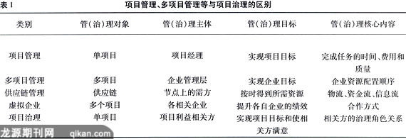 为对项目治理有更清晰的认识,需要对与其有密切关系的管理领域如项目管理、多项目管理、供应链管理以及虚拟企业管理等进行一个比较。它们之间的区别如表1所示。