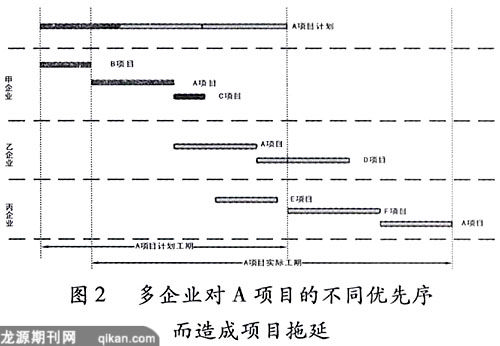 对于多个组织共同参与的项目而言,失败的例子比比皆是,造成失败的原因大多在于其管理依然沿用单项目管理和企业项目管理方式。对于多组织共同完成一个项目(以A项目为例)的情况来说,各个组织就像是一个个职能部门,项目被切成一块块交给这些组织完成(见图1),这种方式类似于人们熟知的职能制项目管理方式。但是,各个组织一般都有多个项目需要完成,它们追求自身效益最大化的决策结果必然会造成其对A项目的优先次序是不一样的,这种排序不同的结果会增加A项目延期或失败的可能性(见图2)。更为糟糕的是,在一个组织内部的职能部门之间还可以彼此协调,必要时可以通过上级领导来强制集中资源以完成某项目,但多个组织之间却难有这种协调机制,也难有这样的强权人物。这种常见问题的解决已超出了项目管理的研究范畴,而站在一个组织立场上的多项目管理恰恰是造成这种问题的原因,当然也不能解决这种问题。