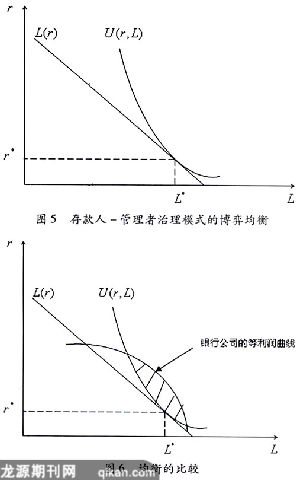 直线L(r)与银行公司每条等利润线交于最高点。有前面的分析,在存款人一管理者治理模式中的博弈均衡可由图5表示出:在均衡中对存款人数量L的限制似乎是难以理解的,因为我们不可能就此认为对一个银行公司来说竟然存在一个最优的存款人数量,但本文前面已经证明在均衡时的L可以看作为项目的风险系数。将图5与图6进行比较,我们可以发现这一均衡是低效率的。