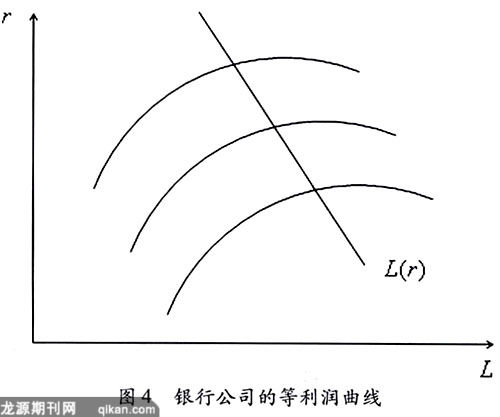 首先我们考察在由存款人数量L以及利率r所张成的二维平面中银行公司的利润曲线,如果L保持不变,则r降低时银行公司的利润水平就会提高,因此图4中较低的等利润曲线就代表了较高的利润水平。