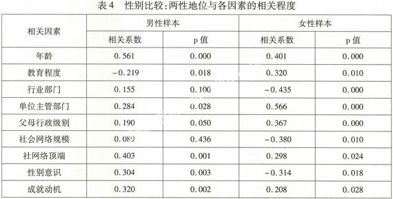 除此之外,我们还进一步比较了影响两性干部职业地位的因素,表4是对两性样本分别进行职业地位与各因素相关检验的结果。
