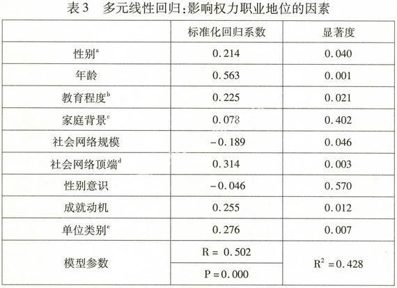 动机、教育程度、性别和社会网络规模。这说明,在权力职场中,工作资历、个人交往层次、单位资源、个人的目标预期、学历等对干部的职级均会产生较大影响。性别对干部职级产生了一定的影响,但其作用力并不是最大的,仅居于上述因素之后。换言之,女性干部职级总体上低于男性干部,性别因素在其中发挥了作用,但这一状况也与多种因素有关。其中性别非但不是唯一因素,而且也不是最重要的因素。